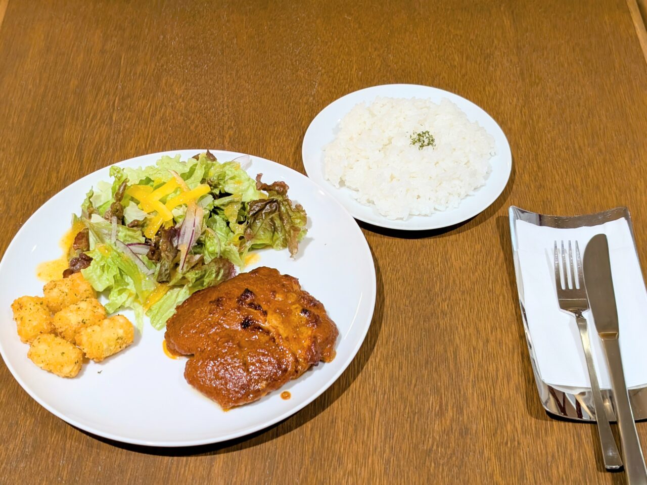 チキンをナイフで切りながら、ハッシュポテトやシャキシャキの野菜と一緒に味わいました。
