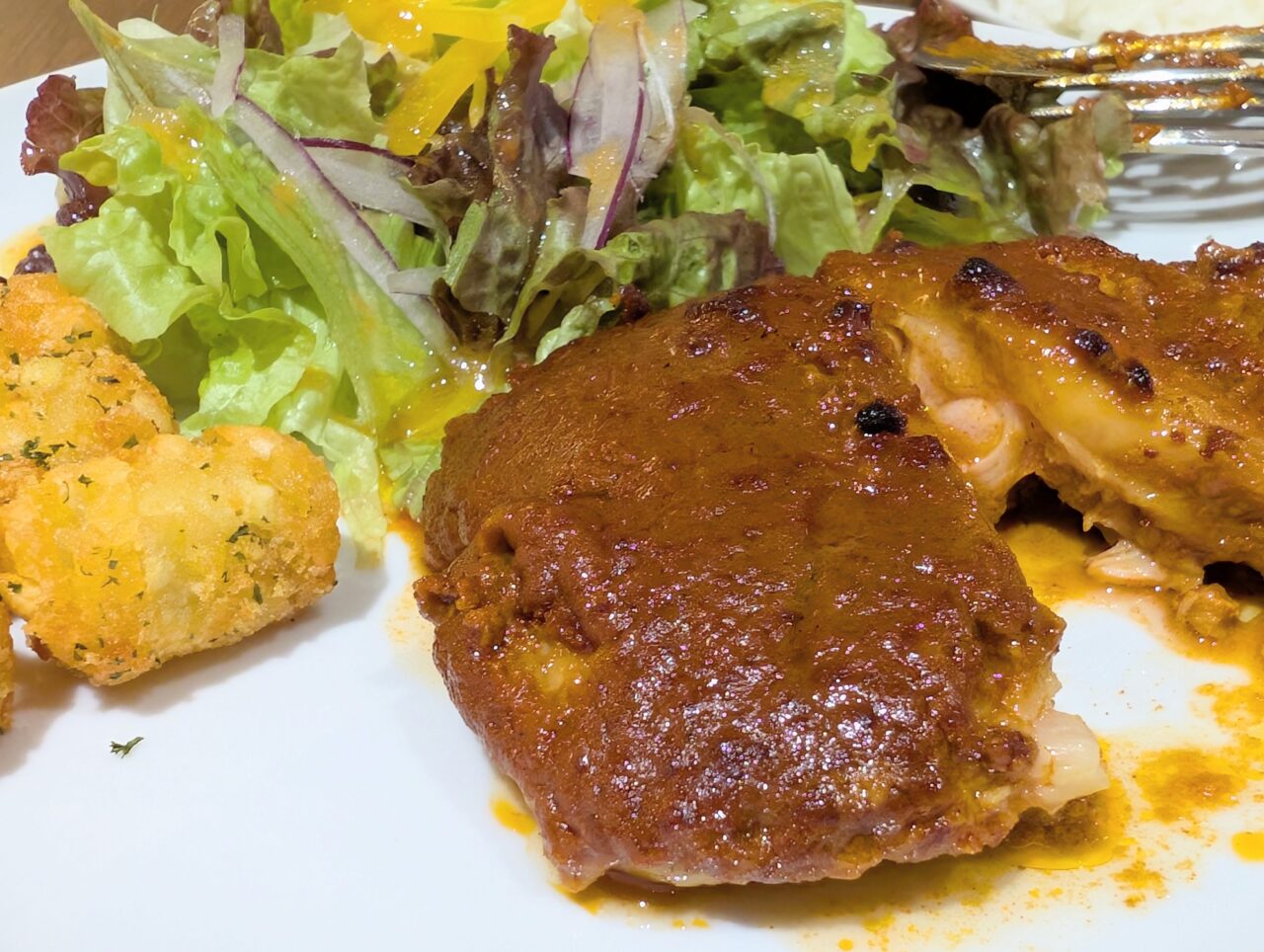 メインのタンドリーチキンは、香ばしいもも肉にスパイスの香りがほどよくきいた一皿。