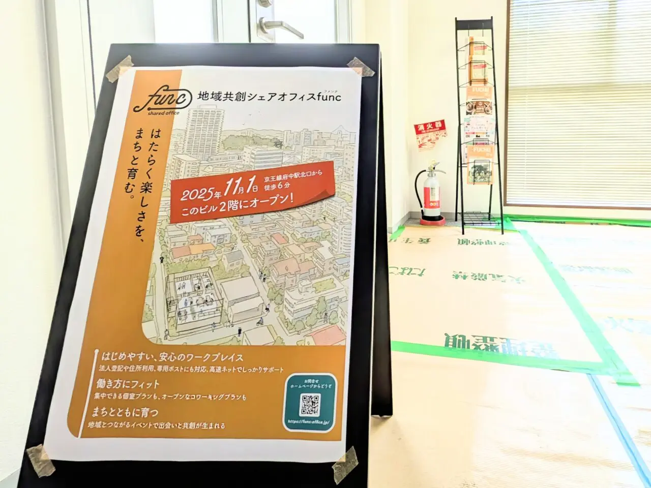 京王線府中駅から徒歩6分ほど。地域の新しい拠点として、シェアオフィス「func(ファンク)」が2025年11月1日(土)にオープンします。