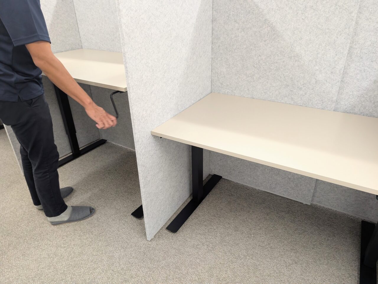コワーキングスペースの机は幅も奥行きも余裕があり、モニター設置後もゆったりと作業が進められそうです。高さを変えることができるので、作業時間が長くなるときには思い切って高めに調整し、立って作業をすることも可能です。