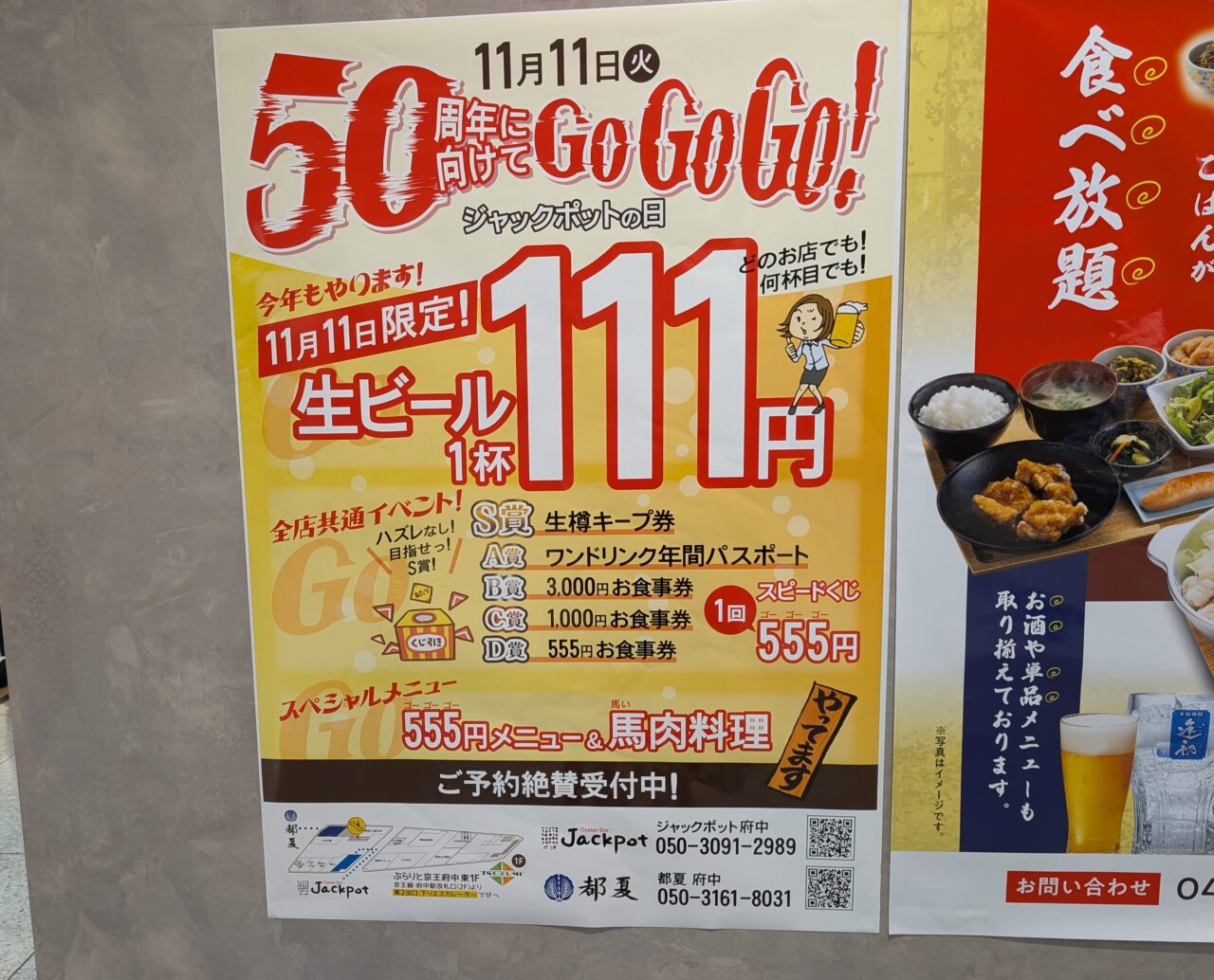 【府中市】今年もやります!11月11日(火)はジャックポットの日!ビールが111円で楽しめます!
