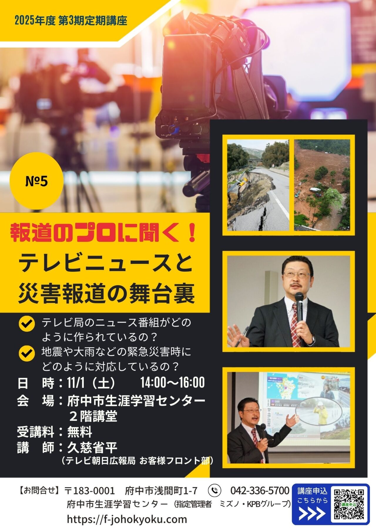 【府中市】※無料講座開講※テレビニュースの裏側に迫る!災害報道の舞台裏を報道のプロが語ります