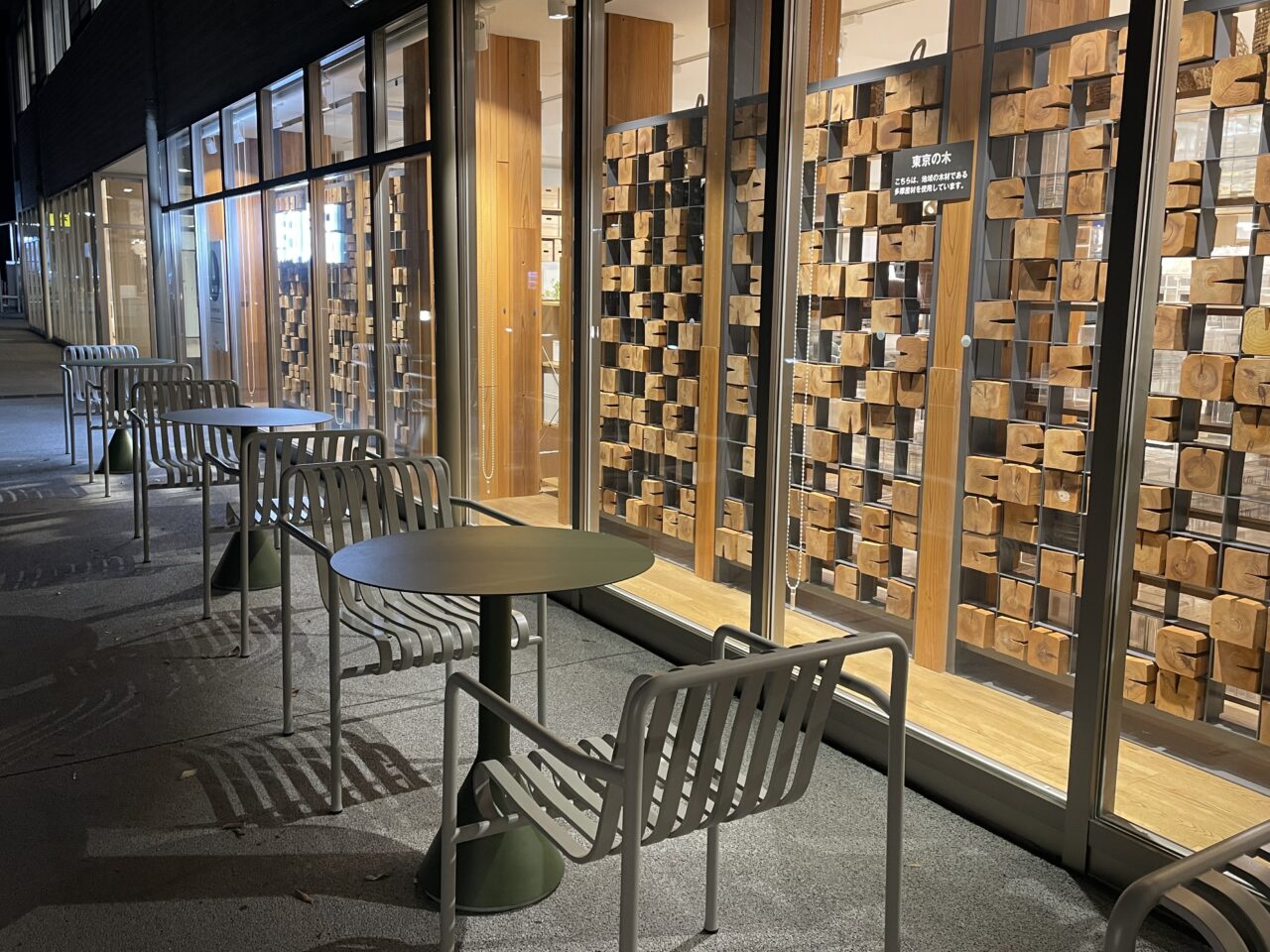 オシャレな外観で、特に夜に映える照明と木目が綺麗です。学生だけでなく、一般の方も利用可能です。店外にはテーブルスペースもあります。