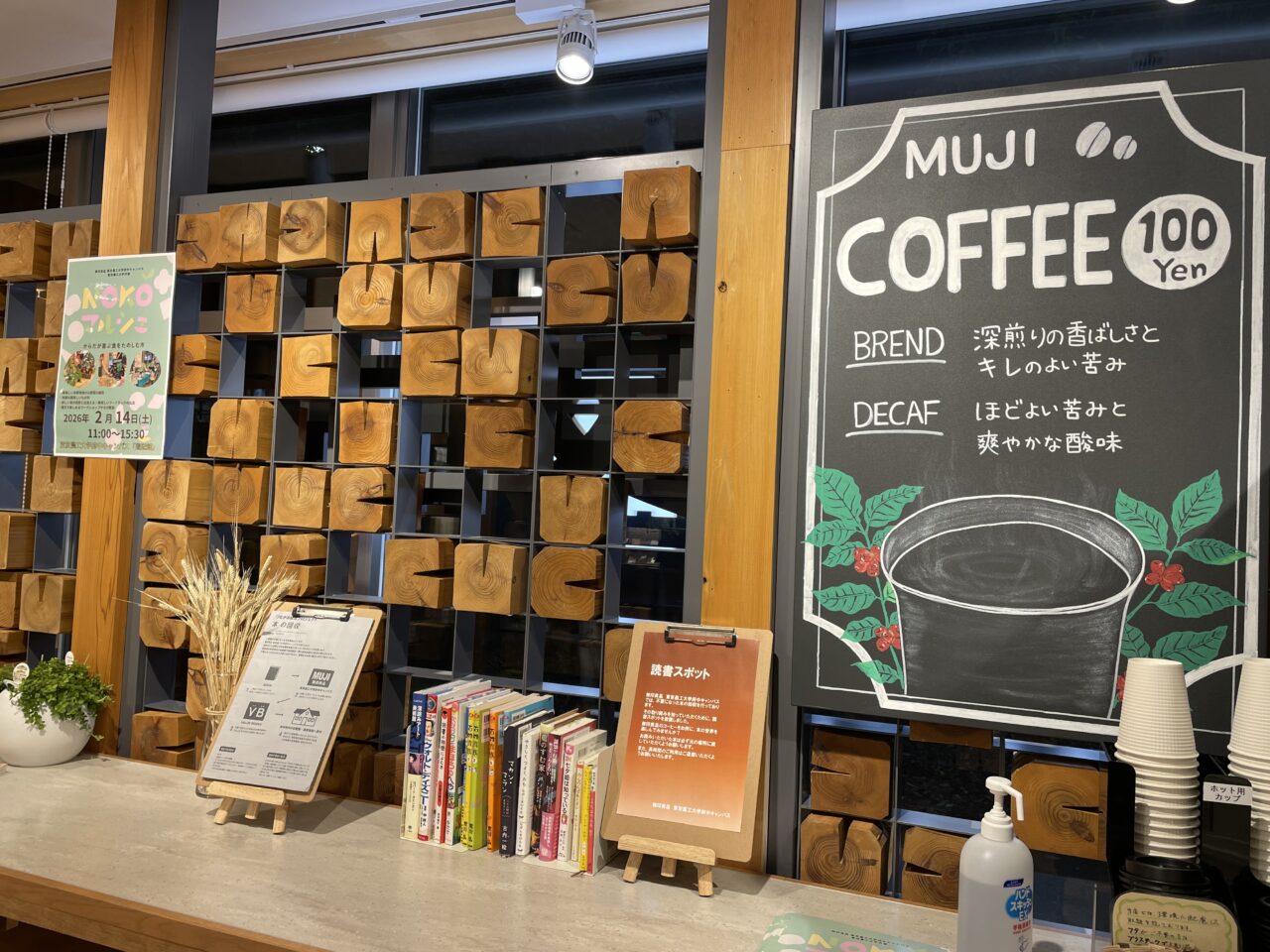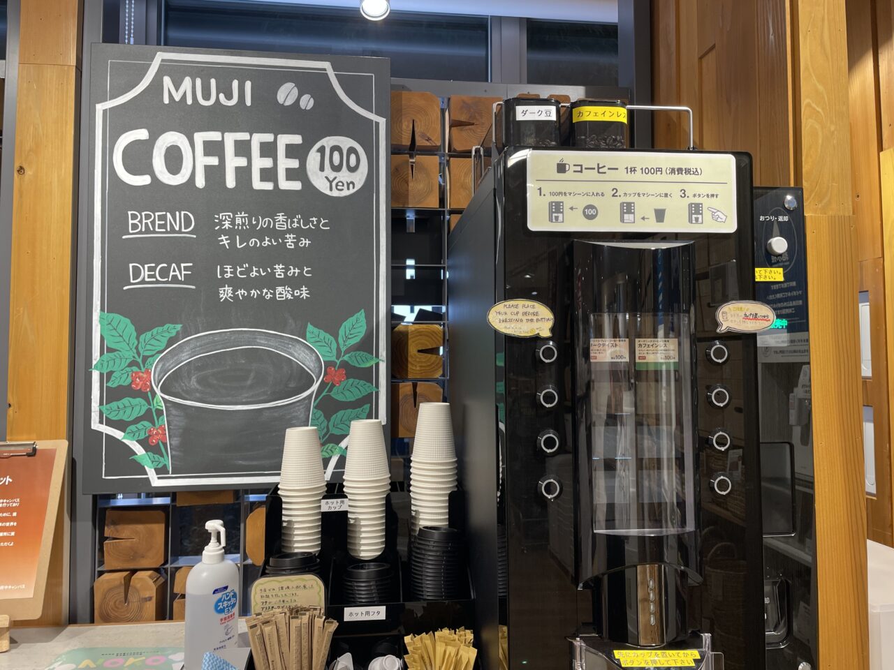 こちらの店舗では、100円で珈琲を購入することができます。その名も「MUJI COFFEE」、珈琲豆やドリップ珈琲も種類が豊富です。店舗にて購入可能です。